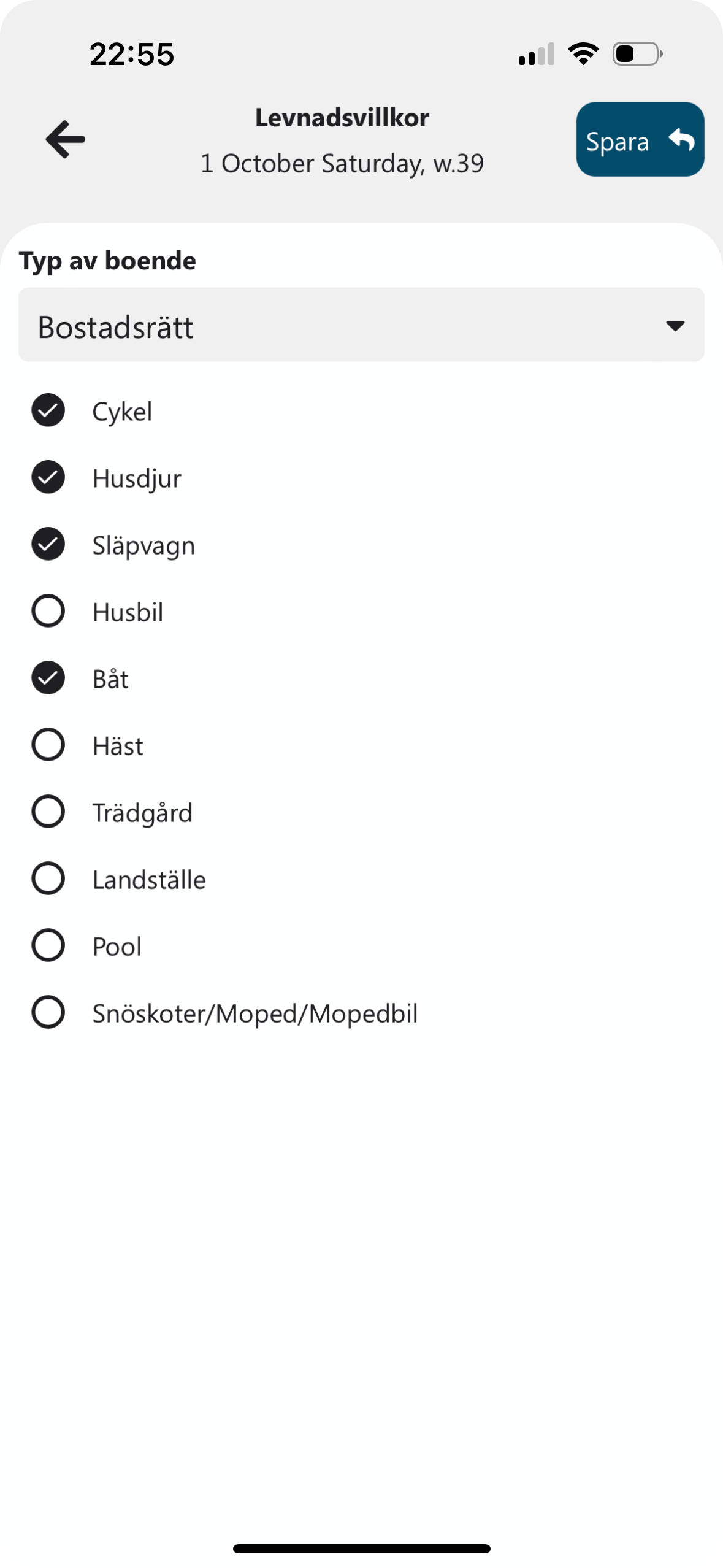 | Levnadsvillkor | Levnadsvillkor är ett antal val, kryssrutor. Dessa används för att ge dig relevant information. Bor du i hus kan du få händelser o tips som har med hus att göra, o.s.v. | INGEN FÄRG |