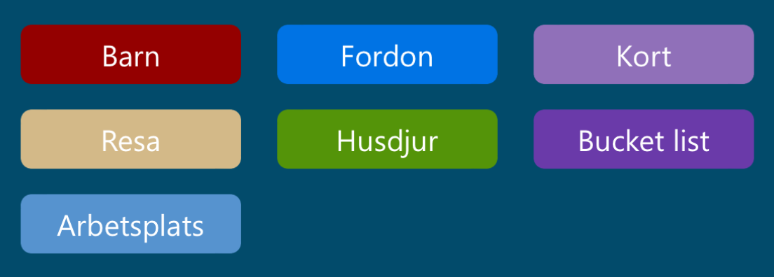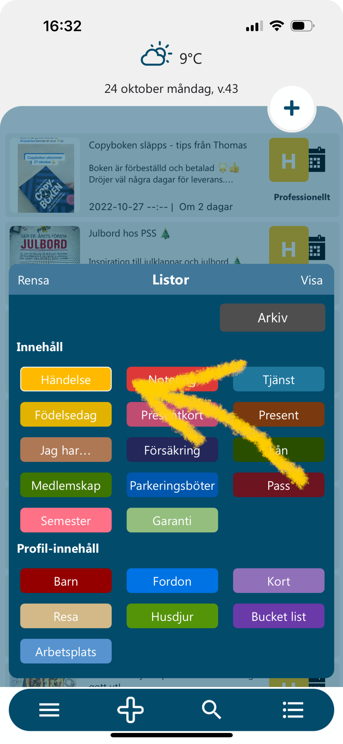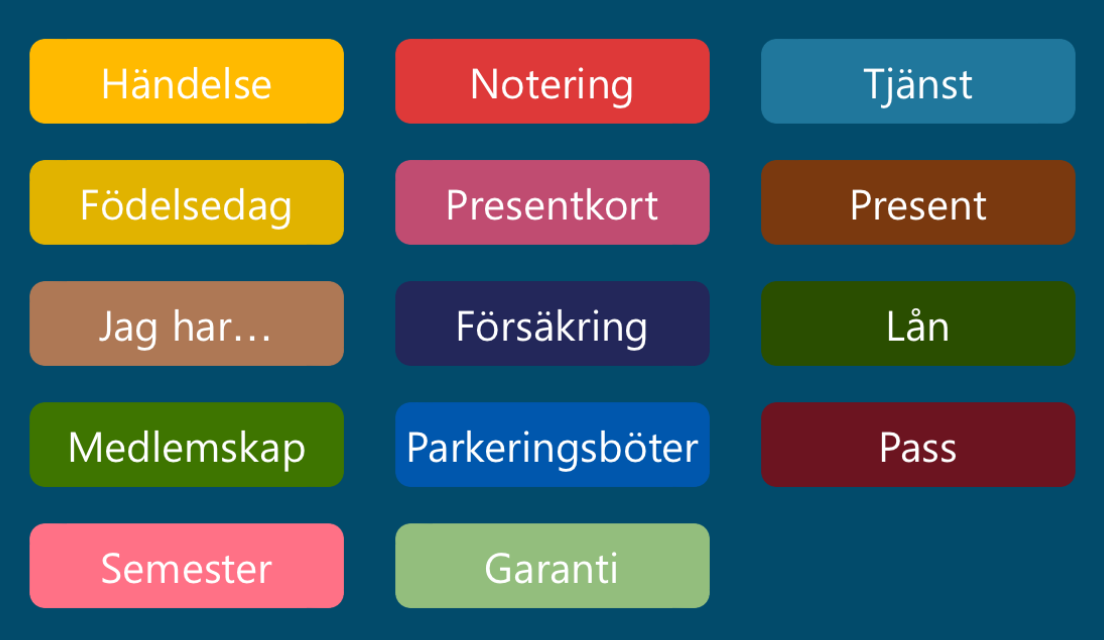 Händelse, Notering, Tjänst, Födelsedag, Presentkort, Present, Jag har..., Försäkring, Lån, Medlemskap, Parkeringsböter, Pass, Semester, Garanti.