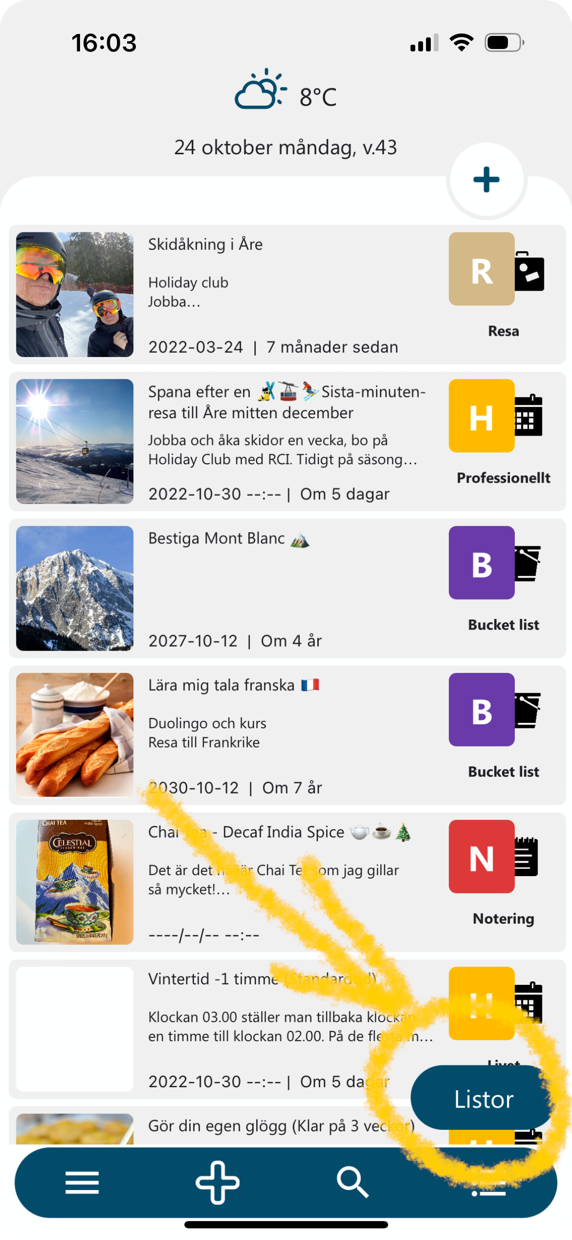 Du når listorna genom att från startsidan klicka på listsymbolen, längst ned till höger. På Listsidan klickar du på 'Listor' för att göra dina val.