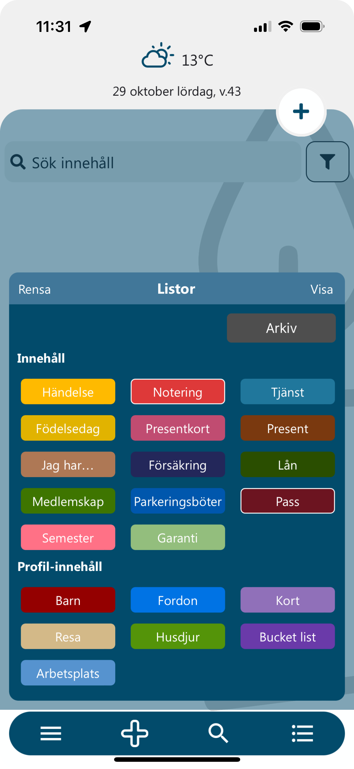 I Pluslife är allt innehåll sökbart, du kan söka på i princip vilken text, datum eller värde som helst och få upp det du söker efter.