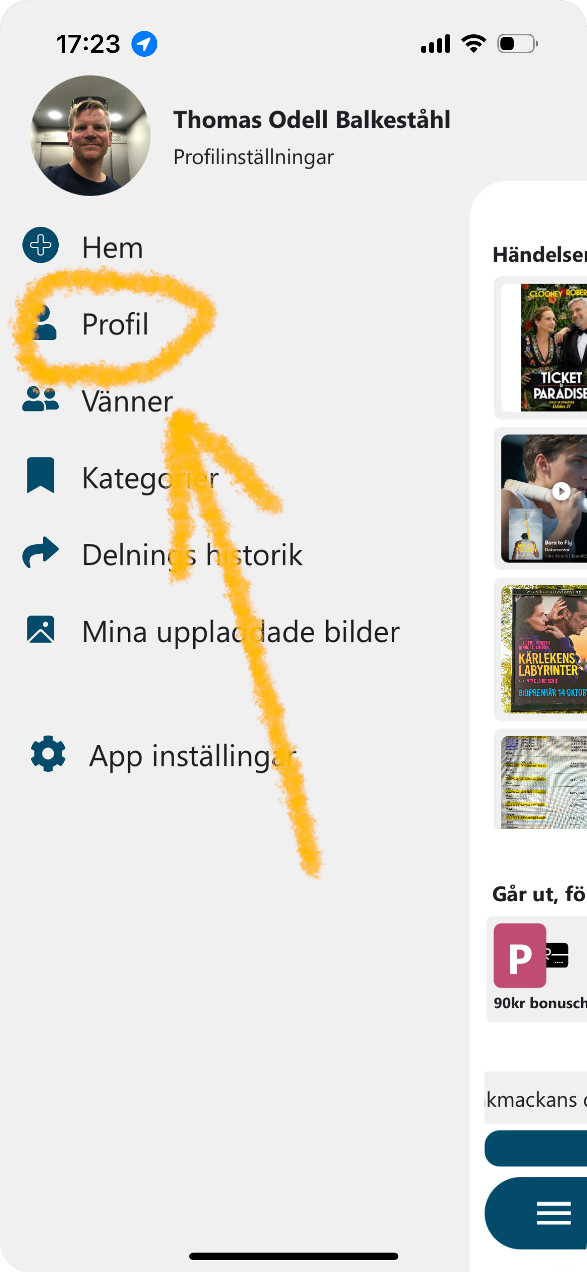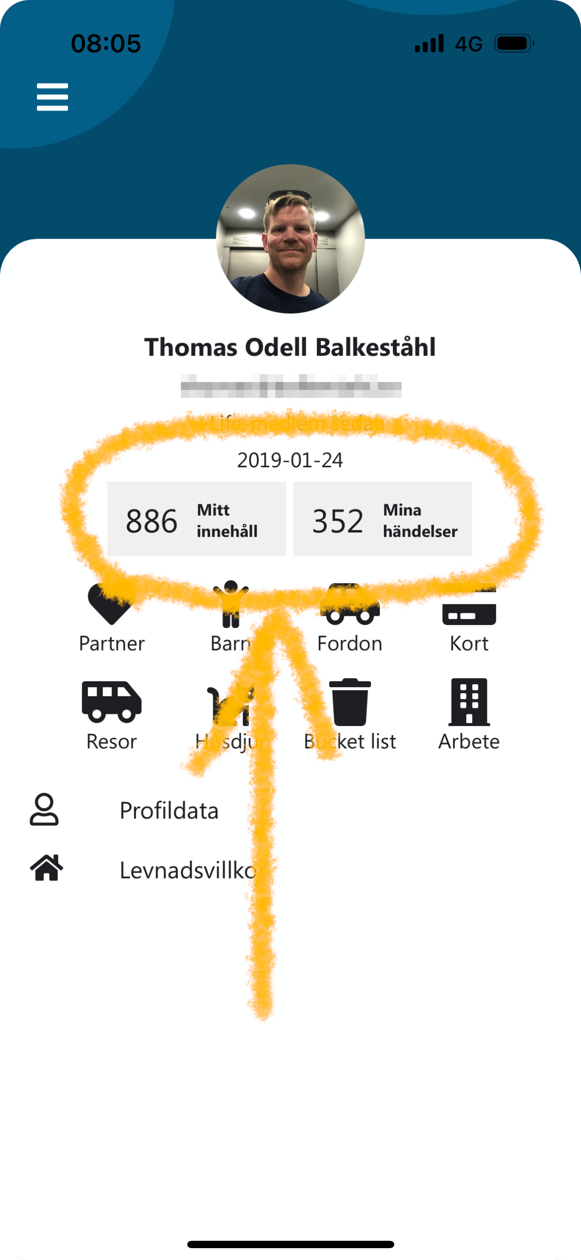Du hittar dina siffror på profilsidan, som du når genom att klicka på inställningar (Även svajpa från vänster) och sedan 'Profil'