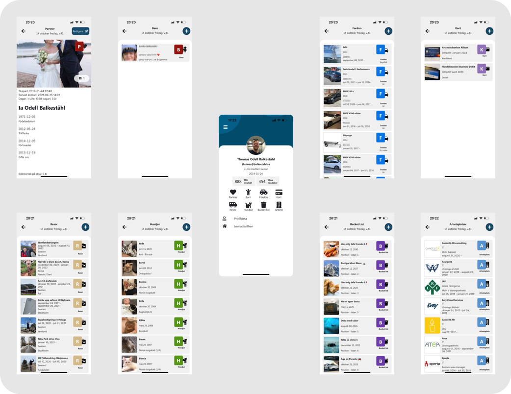 Del 2 är ’Profil’ som du når via ’Meny’ – ’Profil’. I profilen har du åtta olika innehållstyper du kan lägga till, samt två olika listor med personspecifika val. Innehållstyperna är ’Partner’, ’Barn’, ’Fordon’, ’Kort’, ’Resor’, ’Husdjur’, ’Bucket’ list samt ’Arbete’.