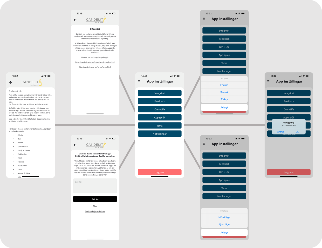 Del 4, ’App inställningar’. Här finns det som rör appen, lite länkar o texter om appen, här kan du skicka feedback, du väljer språk, mörkt eller ljust tema och du ställer in hur du önskar få dina notiser.