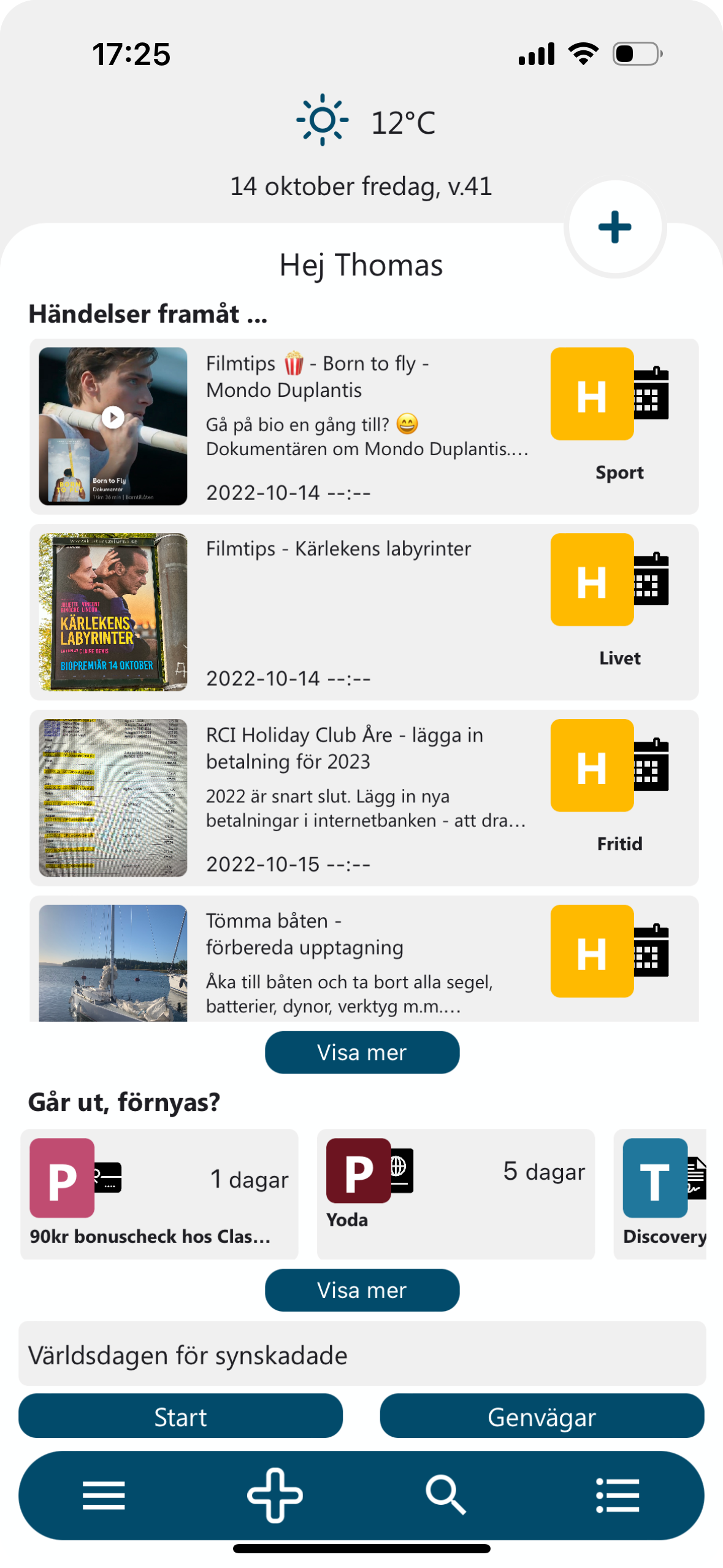 Del 1 är ’Innehåll’, med startsidan där du ser din lista över vad som händer härnäst. Härifrån kan du navigera via den nedre menyraden till menyn med inställningar, startsidan, söksidan och listsidan. Här finns även plusknappen, där du skapar nytt innehåll. Du kan få fram sidan med snabb genvägar och tillbaka igen via Start/Genvägar-knapparna. Du kan också få fram hela de speciella listorna som visar ’Händelser framåt…’ och ’Går ut, förnyas?’ på knapparna under respektive del.