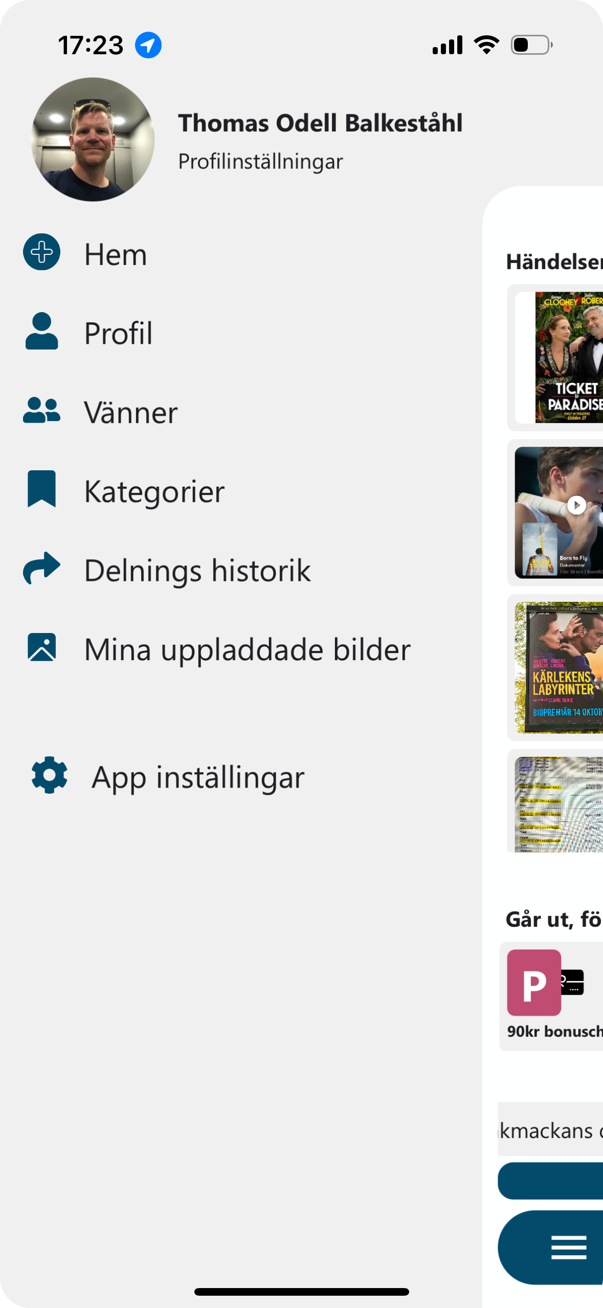 Del 3 är så ’Meny’ där du hittar ett antal olika inställningar, val, historik och liknande. I grundmenyn hittar du ’Vänner’, ’Kategorier’, ’Delningshistorik’, ’Mina uppladdade bilder’ samt ’App Inställningar’