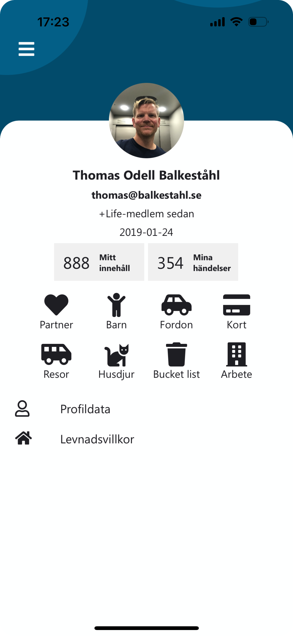 Del 2 är ’Profil’ som du når via ’Meny’ – ’Profil’. I profilen har du åtta olika innehållstyper du kan lägga till, samt två olika listor med personspecifika val. Innehållstyperna är ’Partner’, ’Barn’, ’Fordon’, ’Kort’, ’Resor’, ’Husdjur’, ’Bucket’ list samt ’Arbete’.