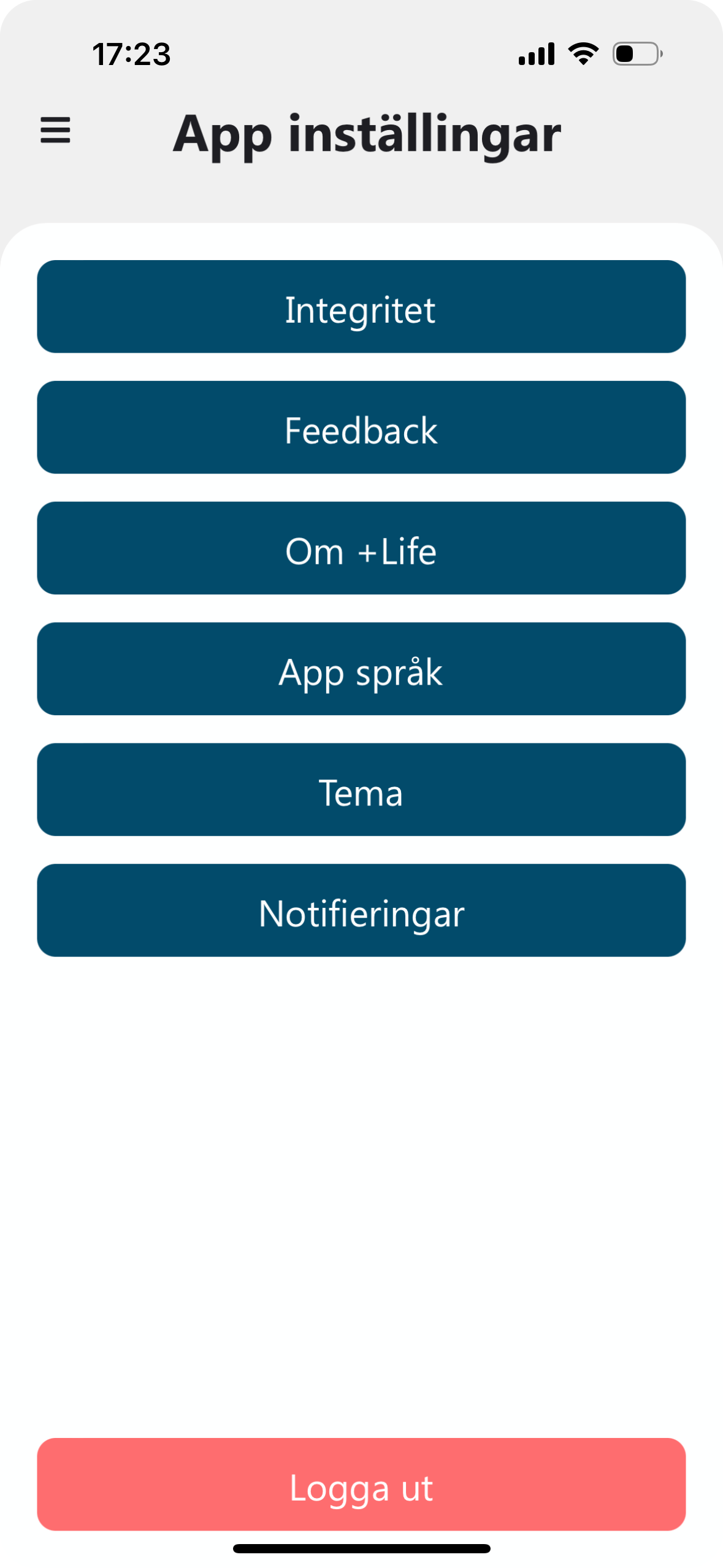 Del 4, ’App inställningar’. Här finns det som rör appen, lite länkar o texter om appen, här kan du skicka feedback, du väljer språk, mörkt eller ljust tema och du ställer in hur du önskar få dina notiser.
